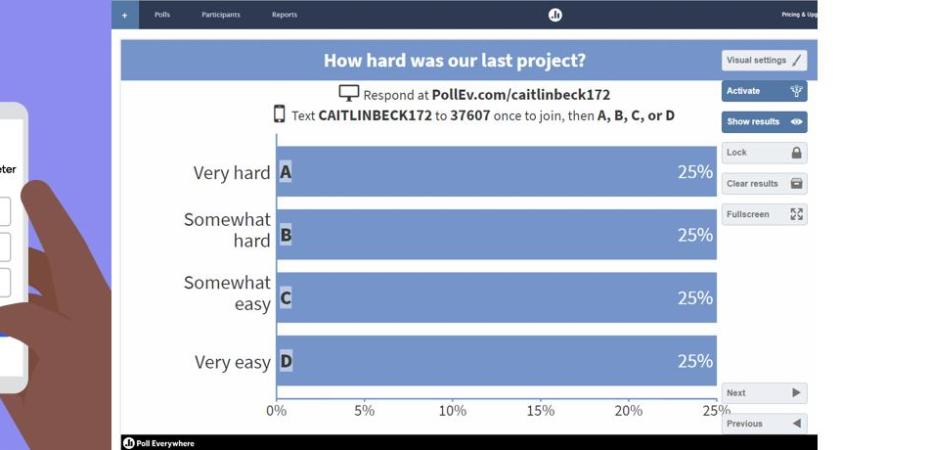 - Audience members can respond via a web link or SMS, and results update in real-time.